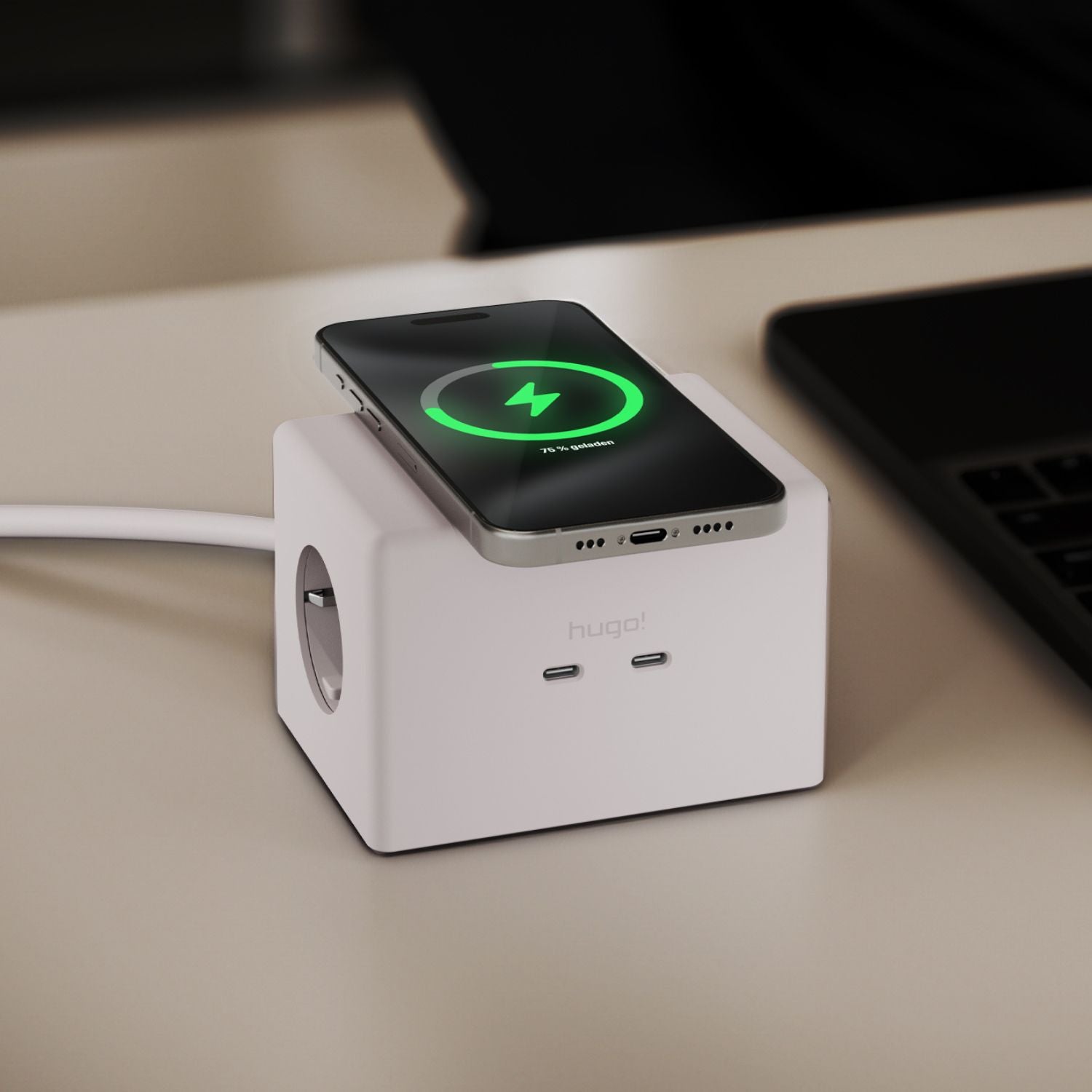 Der hugo! ONE Steckdosenwürfel lädt deine Geräte mit 2 praktisch angeordneten Schutzkontakt-Steckdosen, 2 USB C Anschlüssen für schnelles Laden und Wireless Charging Ladepad.